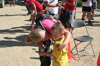 After what felt like forever, I finally made it to the "last bend" and could see the finish line down below. I was so happy that I had made it that I almost allowed my emotions to get the best of me again. Before I knew it, I could see Marcos' giddy face running up to take pictures of me with Dylan following closely behind. Poor Preston was locked in the stroller wondering what was going on. It was so good to see my family that I could barely focus on the race. They announced my name and someone pointed me to the finish line that was right off the side of the road. I was kind of in a daze and was not exactly following what was going on at that point. I had to cross over the little mat that would log my time. They took the microchip off my shoe, handed me my bag and t-shirt and I held Dylan's hand and limped over to find a place on a log to sit down for a minute. I tried to stand up to follow Dylan around for a few minutes. He was so excited to be in the mountains hiking and I wanted to share that excitement with him. Trying to stand up from the log was one of the hardest things ever. Once I let my muscles start to rest, they did not want to get going again. I had to let Papi help Dylan while I drank my gatorade and shared it with my thirsty little baby. Dylan LOVED refilling my gatorade for me though. After a few minutes of rest, I was ready to go home. I wanted to enjoy the moment a little longer, but I was pretty spent and a bit nauseous after chugging my gatorade so I decided I'd have to enjoy the rest of my glory from home.